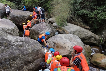 平江福壽山原生態(tài)的溯溪基地,巨石嶙峋,溪流蜿蜒,時而寬,時而窄,時而平緩,時而湍急,要想克服所有艱難險阻到達(dá)終點(diǎn)欣賞大自然的美景就必須整個團(tuán)隊通力協(xié)作,共同前進(jìn)!