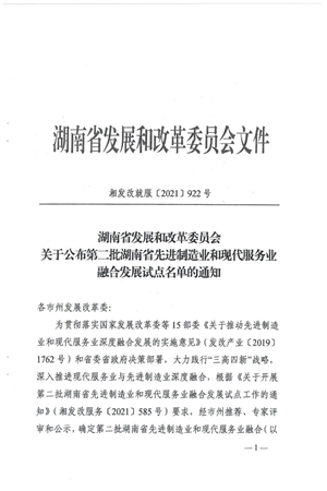 近日,湖南省發(fā)改委公布了納入第二批湖南省先進制造業(yè)和現(xiàn)代服務(wù)業(yè)融合發(fā)展試點名單,全省11家園區(qū)和27家企業(yè)入選,長泰公司成功入選。