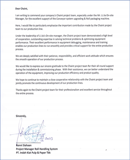 近日,印尼APP集團巴拉望項目向中輕長泰發(fā)來感謝信,對項目現(xiàn)場團隊給予高度認(rèn)可,熱情贊揚長泰團隊精湛的專業(yè)技術(shù)和優(yōu)秀的服務(wù)意識,并多次對現(xiàn)場經(jīng)理李佳表示感謝與贊賞。