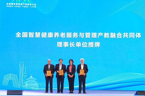 北京市教委二級巡視員楊江林、北京市民政局二級巡視員白玲為“全國智慧健康養(yǎng)老服務(wù)與管理產(chǎn)教融合共同體”揭牌。