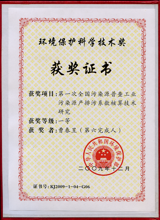 中國(guó)制漿造紙研究院教授級(jí)高工曹春昱和高工馮文英參與的《第一次全國(guó)污染源普查工業(yè)污染源產(chǎn)排污系數(shù)核算技術(shù)研究》項(xiàng)目獲國(guó)家環(huán)保部2009年度環(huán)境保護(hù)科學(xué)技術(shù)獎(jiǎng)一等獎(jiǎng)。