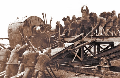 大會(huì)戰(zhàn)時(shí)期,王進(jìn)喜(中)和鉆井工人們?nèi)死缈高\(yùn)鉆機(jī),保障鉆井作業(yè)。(資料圖片)