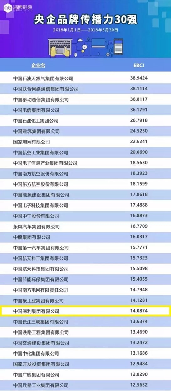 日前,2018上半年中央企業(yè)品牌傳播力榜單(簡(jiǎn)稱“榜單”)新鮮出爐,保利集團(tuán)入圍三十強(qiáng),位列第23位。